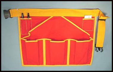 #6HP/CM - This apron is just like the #6HP but has small left and right upper pockets. One of these small upper pockets is for holding things like business cards, and the other one is divided and has two pen/marker sleeves for holding marking type pens. This apron is very popular with balloon artists, clowns, and magicians but certainly NOT limited to just that. Anyone looking for an apron with small upper pockets to put pens, markers, business cars cell phones - whatever. Once again as our name "custom" implies, that is what we do! The stock apron is approximately 22 inches wide by 16 inches high. The front pockets are approximately 9 inches high. Back pockets start at that height and travel upward toward the top edge of the apron. The apron shown here has the optional two inch wide side buckle belt* on it. As in all my aprons, the pocket configuration can be changed as with any apron I make to custom fit your needs.