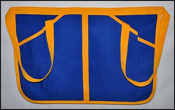 #2A - This is a two pocket apron with two deeper slanted pockets. Instead of pinched pleats, these two pockets have been tapered making the pockets a little tighter and more secure. This apron is approximately 18 inches wide by 13 inches high. As in all my aprons, this can be changed to meet your needs.